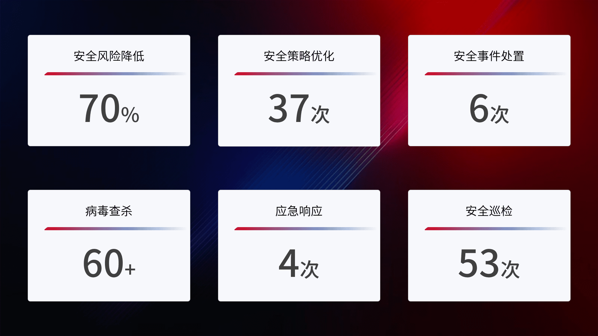 提供全面的安全事件报告体系,,,,包括处置报告、、周报、、、季度和年度总结,,结合持续监控,,,帮助客户深入了解网络安全状况。。。